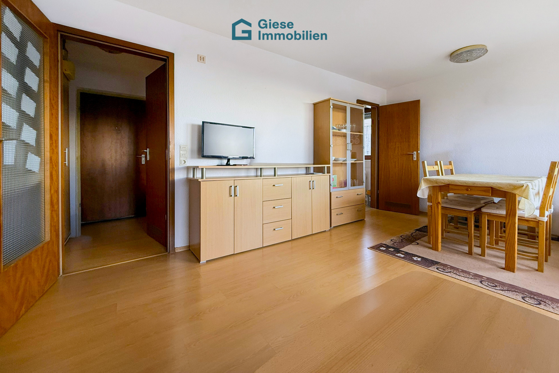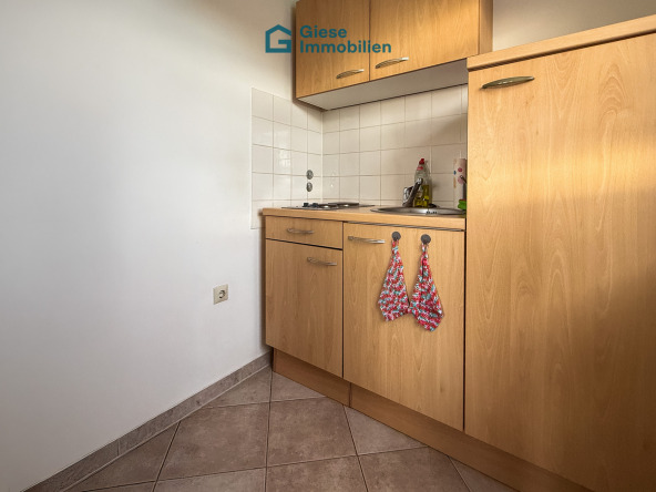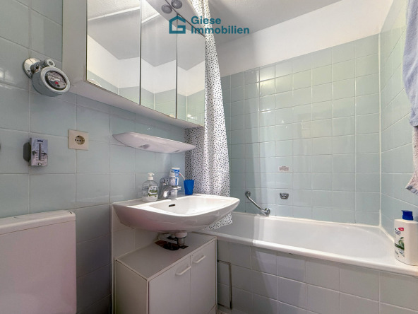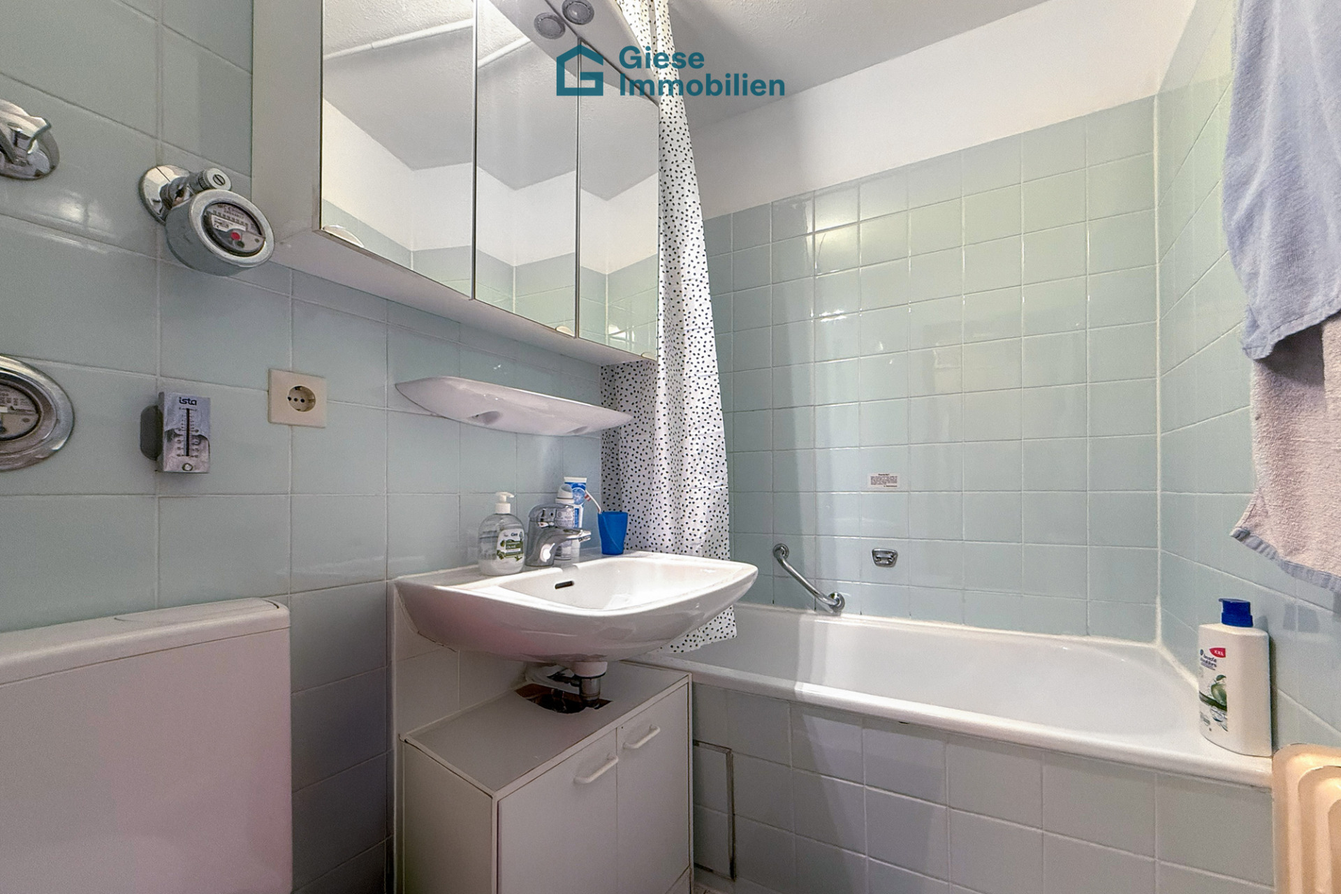 Die Wohnung überzeugt durch ihren klar strukturierten Grundriss: Ein praktischer Flur verbindet alle Räume miteinander, der helle Wohn- und Schlafbereich bietet vielfältige Einrichtungsmöglichkeiten, und der überdachte Balkon erweitert den Wohnraum sinnvoll nach außen. Besonders hervorzuheben ist die vollständig abgetrennte Küche – ein Ausstattungsmerkmal, das in dieser Wohnungsgröße selten ist und von Mietern sehr geschätzt wird. Das gepflegte Badezimmer mit Badewanne, Waschbecken und Spiegelschrank rundet das funktionale Gesamtbild ab.