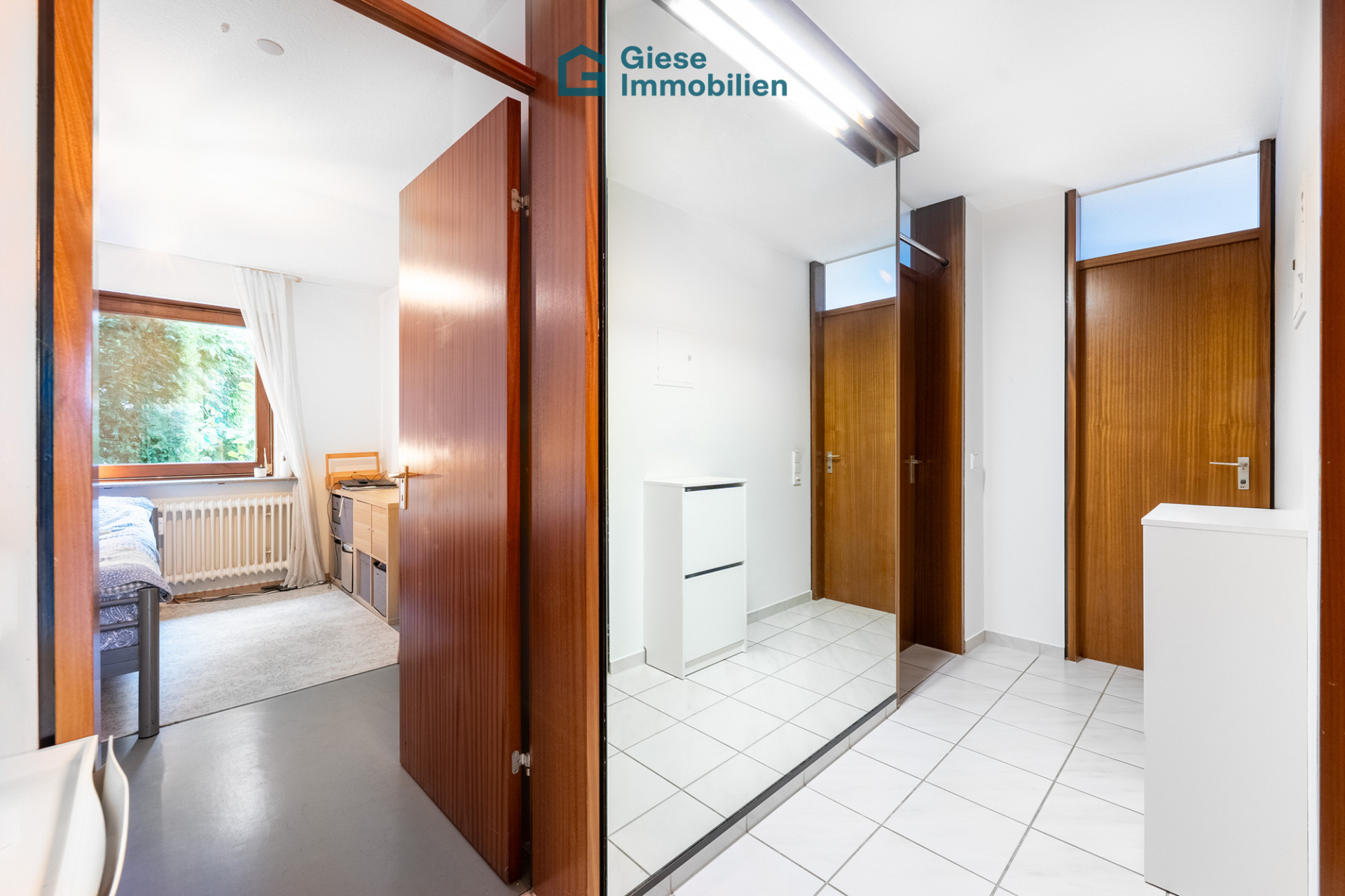 Zurück über den Flur mit dem großen Spiegel erreicht man das Schlafzimmer mit einen großen Einbauschrank, das durch seine ruhige Lage einen geschützten Bereich zum Zurückziehen bildet. Das zweite Zimmer zwei weiteren Einbauschränkenlässt sich flexibel nutzen – beispielsweise als Kinderzimmer, Homeoffice oder Gästezimmer – ganz nach den persönlichen Bedürfnissen.