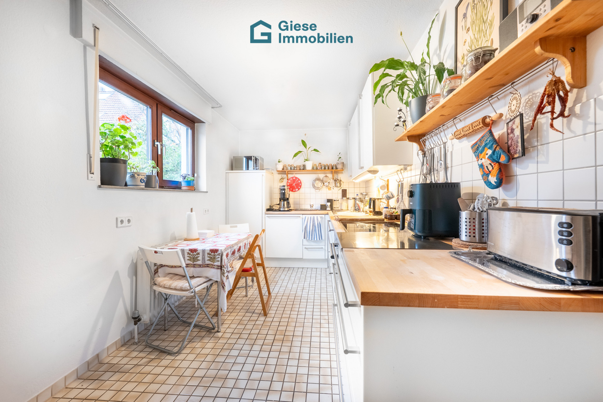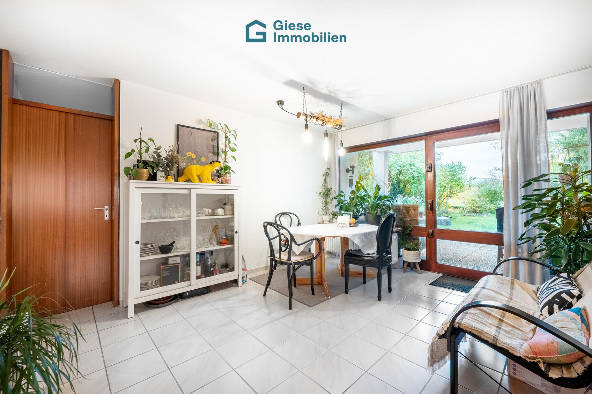 Von hier aus eröffnet sich der direkte Zugang zur überdachten Südterrasse und dem außergewöhnlich großen Gartenanteil, welcher der Wohnung ein unvergleichliches Wohngefühl verleiht – ideal für lange Sommerabende im Freien, gesellige Runden oder einfach einen privaten Rückzugsort mitten im Grünen.