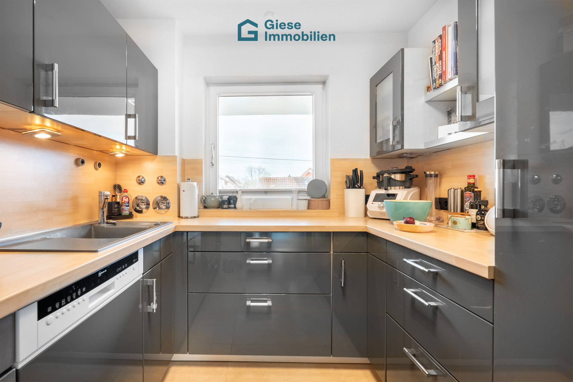 Die im 2015 neu eingebaute Küche ist eigenständig angeordnet und mit modernen Geräten ausgestattet. Viel Arbeitsfläche und der freie Blick nach außen schaffen eine Küche, die sowohl funktional als auch atmosphärisch überzeugt. Desweiteren bietet die untere Ebene ein modernes Gäste-WC und eine praktische Abstellkammer. Stauraum finden Sie ebenfalls unter dem Treppenaufgang wieder.