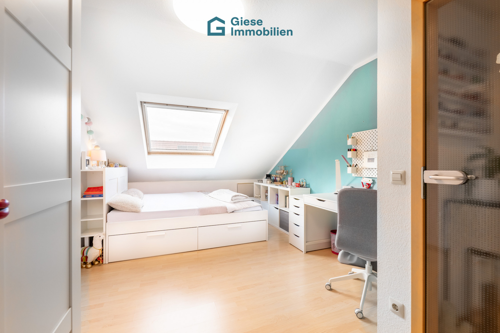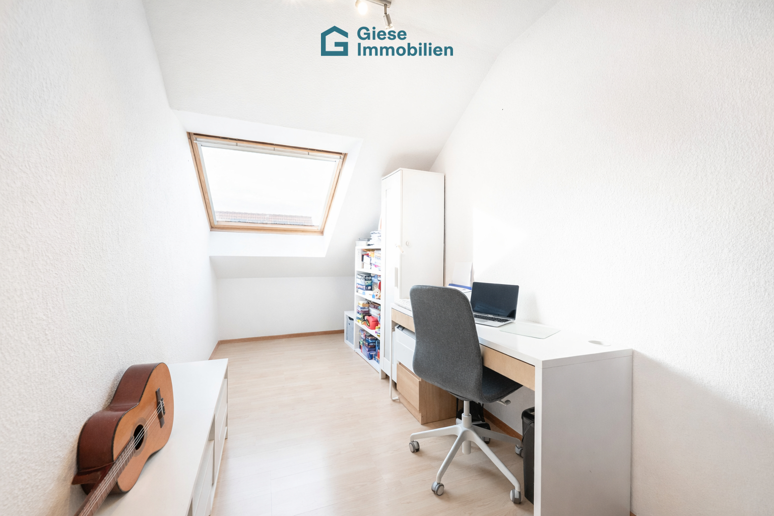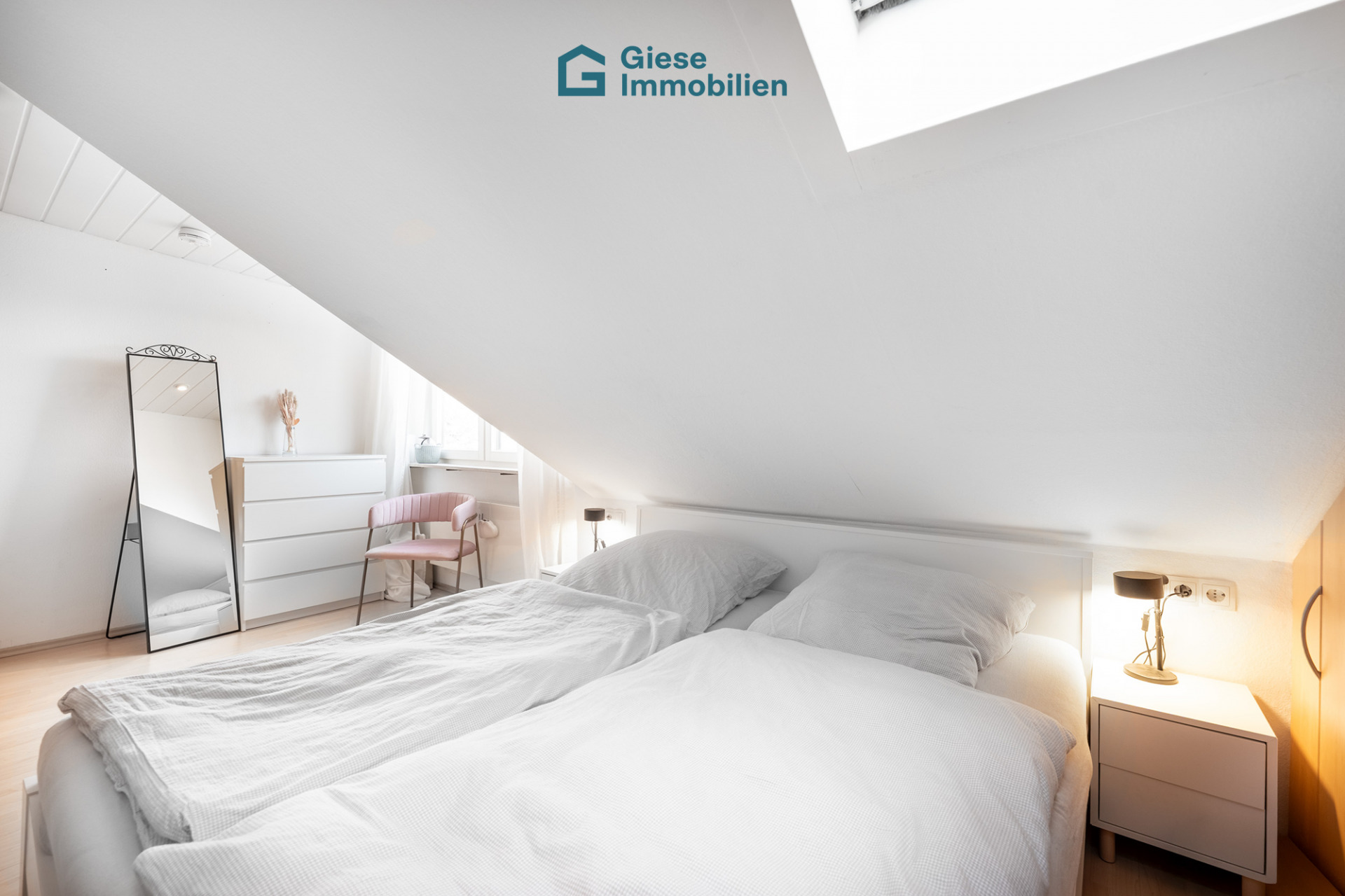 Im oberen Geschoss befinden sich die privaten Rückzugsräume. Das Schlafzimmer ist mit einem praktischen Einbauschrank ausgestattet, der viel Stauraum bietet und den Raum optimal nutzt. Zwei weitere Zimmer eignen sich flexibel als Kinder-, Arbeits- oder Gästezimmer. Diese Räume können gegebenenfalls auch zusammengelegt werden. Neu eingebaute, großflächige Dachfenster lassen hier viel Tageslicht einfallen und schaffen trotz Dachschrägen ein offenes und großzügiges Raumgefühl.