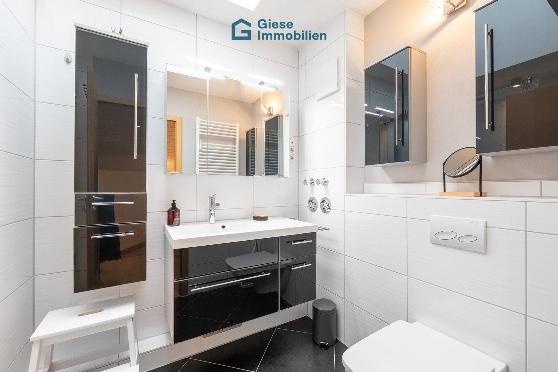 Das modern gestaltete Tageslichtbad überzeugt durch seine hochwertige Ausstattung und wird über ein automatisch steuerbares Dachfenster mit viel natürlichem Licht versorgt.