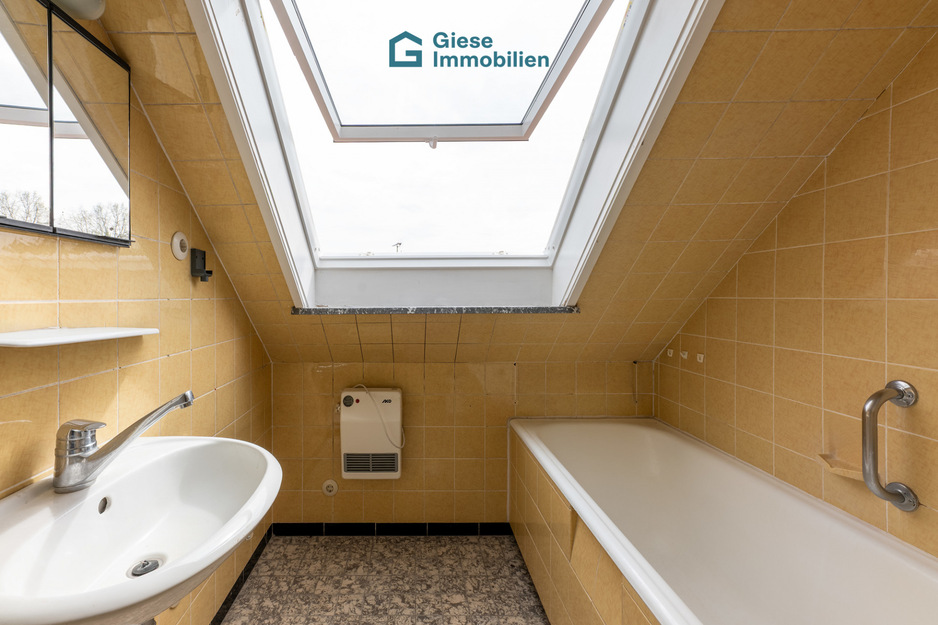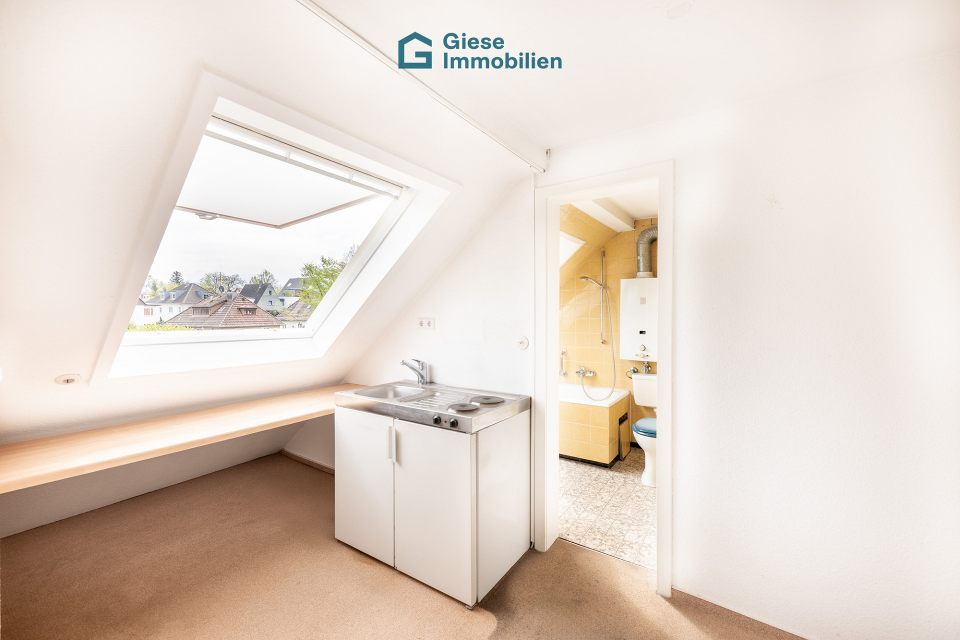 dg – große dachfenster, badezimmer mit badewanne, wc und waschhbecken, großes dachfenster, kleine küche, 3 zimmer