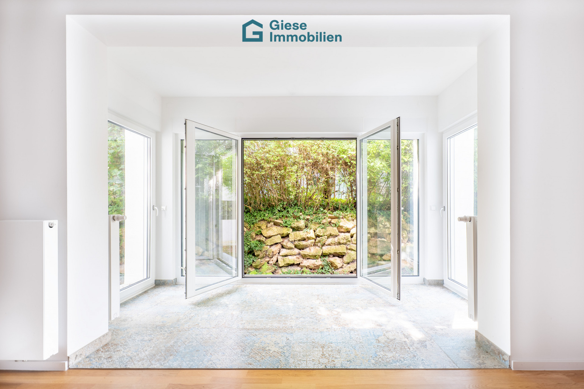 Ein besonderes Highlight ist die großzügige Terrasse mit direktem Zugang ins Grüne. Sie erweitert den Wohnraum nach draußen und lädt dazu ein, entspannte Stunden an der frischen Luft zu verbringen. Ob ein ruhiger Start in den Tag mit einer Tasse Kaffee oder ein entspannter Abend in natürlicher Umgebung, dieser Außenbereich bietet einen hohen Erholungswert und macht das Wohnen besonders attraktiv.
