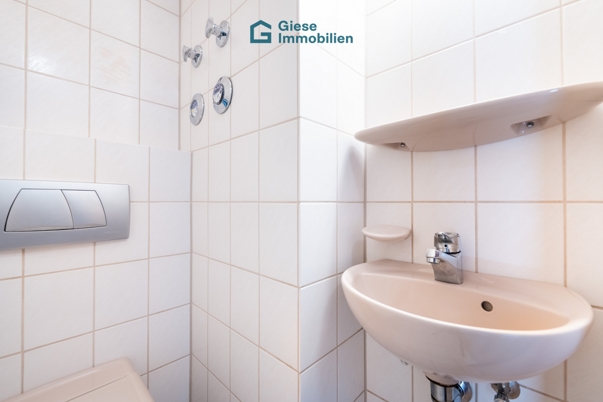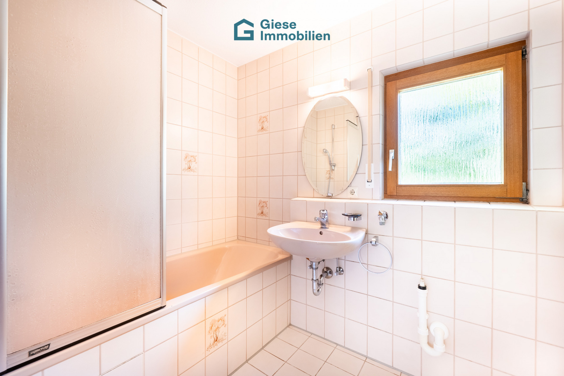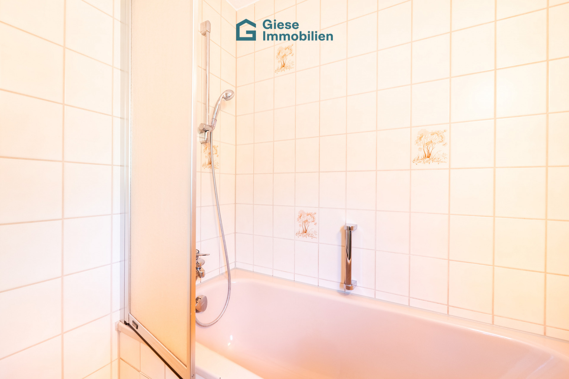 Die separate Küche ist funktional geschnitten und durch ein Fenster angenehm hell. Sie verfügt über Einbauten, die ausreichend Stauraum bieten, und kann bei Bedarf individuell modernisiert werden. Küche und Bad sind gefliest, während in den übrigen Räumen Teppichboden verlegt ist. Das Tageslichtbad ist mit einer Badewanne ausgestattet und klassisch gefliest. Ergänzt wird die Wohnung durch ein separates Gäste-WC, das zusätzlichen Komfort bietet.