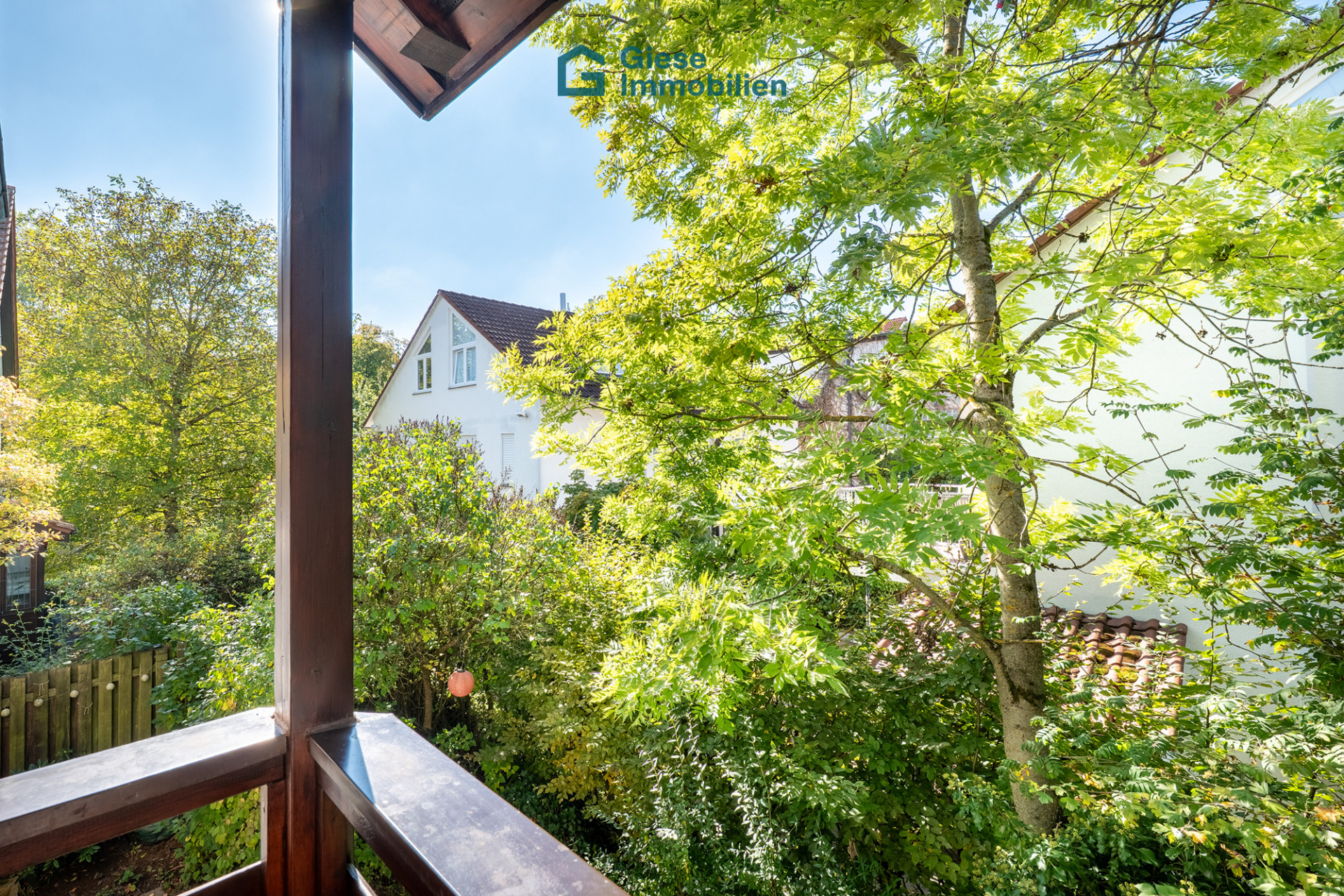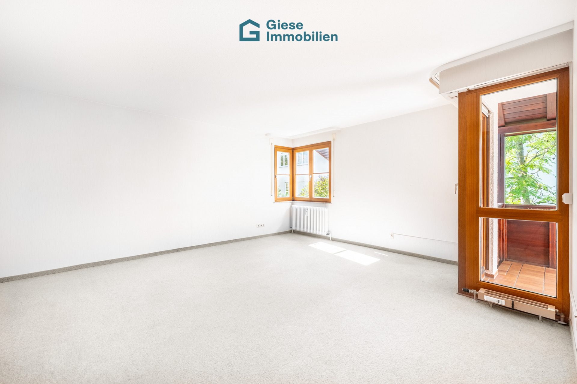 Das lichtdurchflutete Wohnzimmer bietet ausreichend Platz für einen gemütlichen Wohn- und Essbereich. Von hier aus betreten Sie den überdachten Balkon, der mit seinem Blick ins Grüne zum Verweilen und Entspannen einlädt. Ob ein Frühstück an der frischen Luft oder ein ruhiger Feierabend – dieser Platz bietet eine angenehme Erweiterung des Wohnraums.