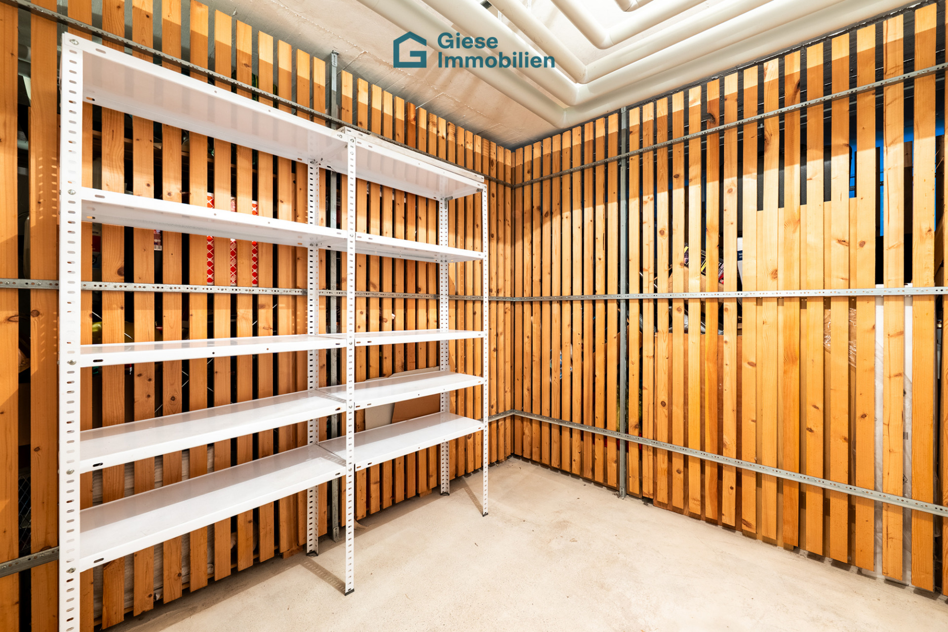 Ein echtes Plus ist der großzügige Kellerraum. Mit stabilen Regalen ausgestattet, bietet er reichlich Stauraum und ermöglicht eine optimale Organisation von Vorräten, Werkzeugen oder Saisonartikeln.