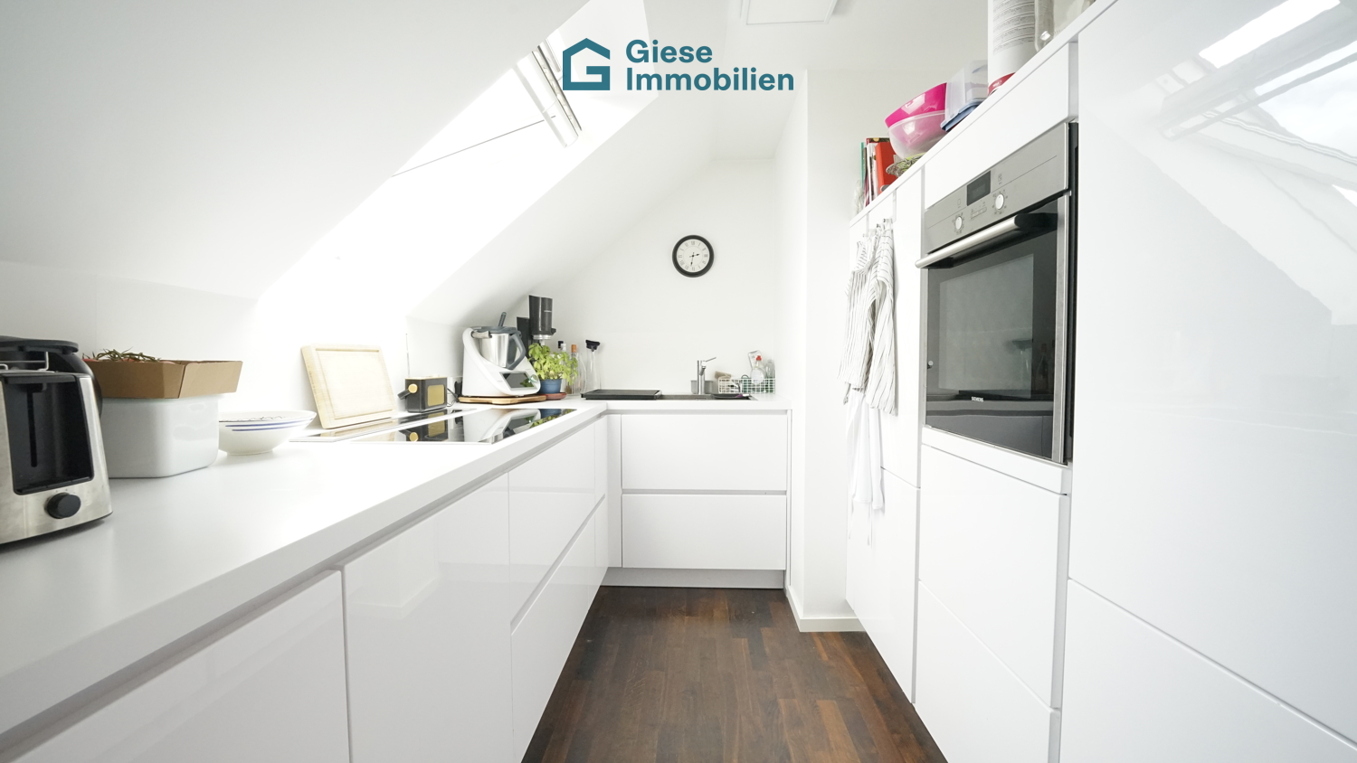 Die halboffene Küche hat hochglanz-weiße Fronten und ist mit hochwertigen Elektrogeräten ausgestattet.