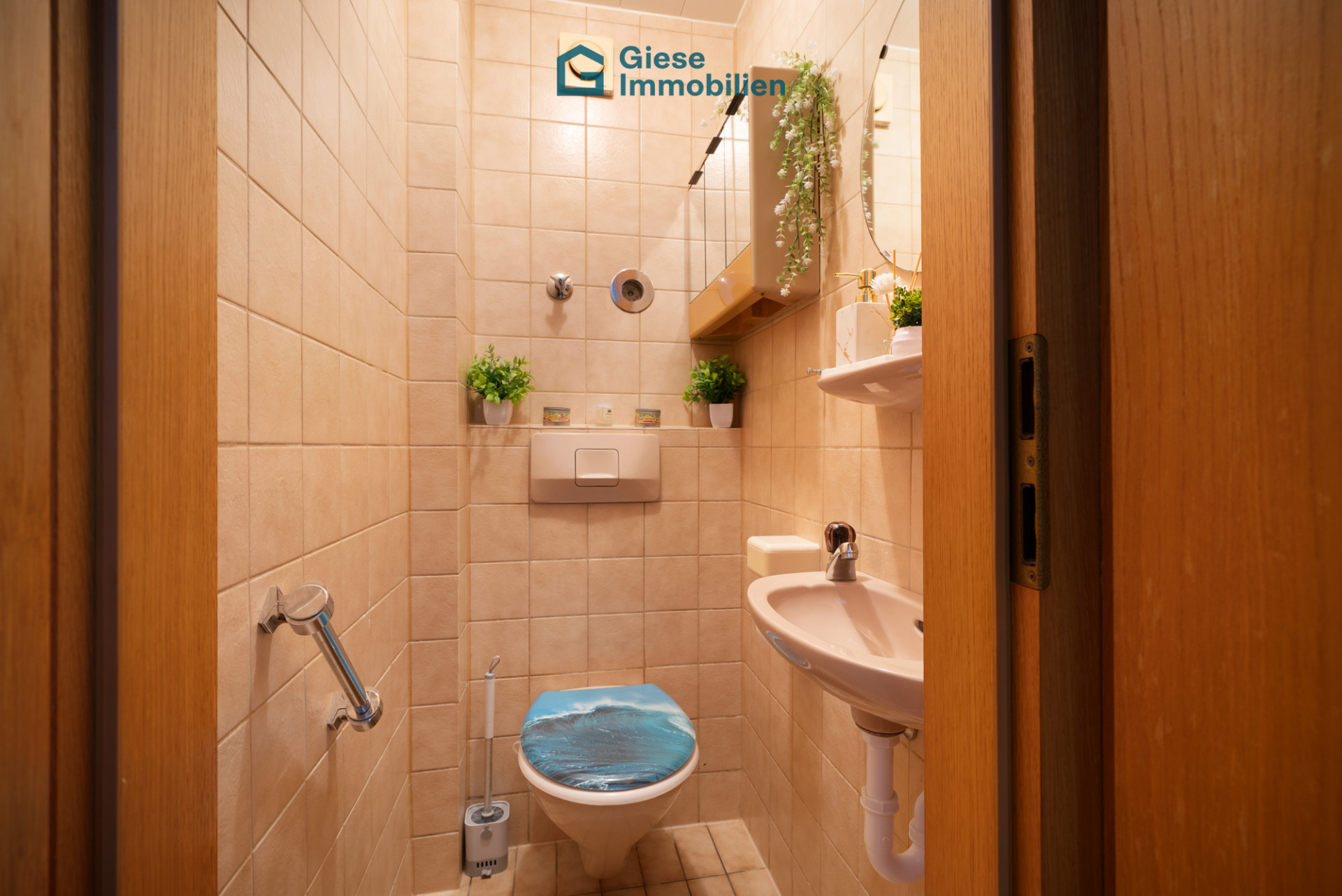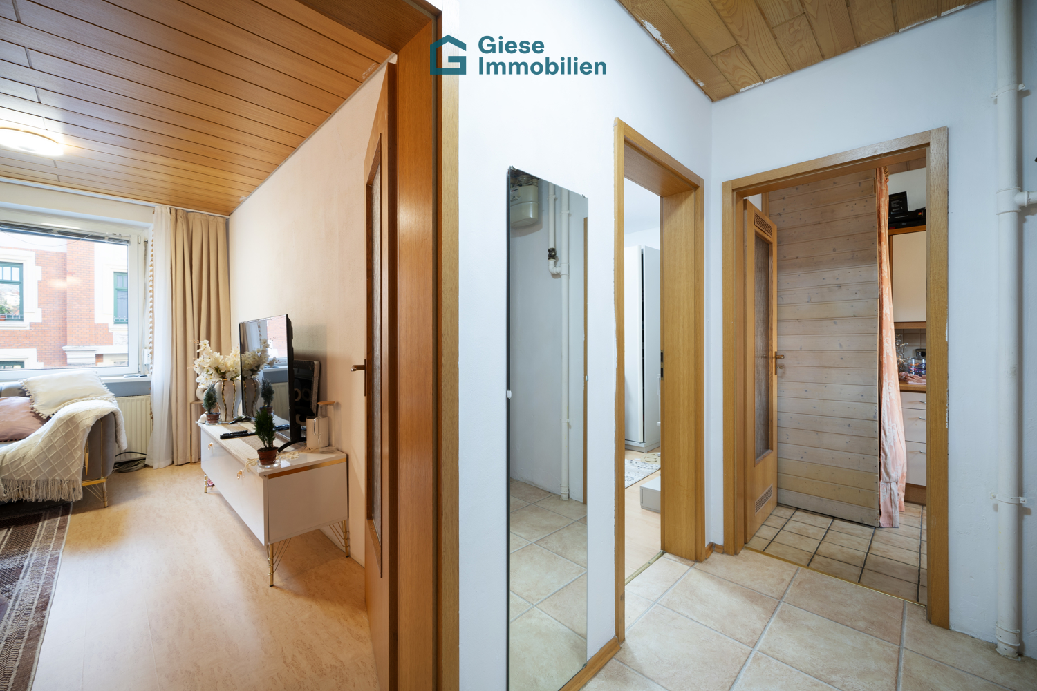 Der Grundriss ist klar und funktional: Vom Flur aus sind alle Räume erreichbar. Das Wohnzimmer ist hell und angenehm geschnitten, das Schlafzimmer bietet ausreichend Platz. Die Küche ist kompakt und zweckmäßig, das Tageslichtbad verfügt über einen Waschmaschinenanschluss. Ein separates Gäste-WC ist ebenfalls vorhanden.
