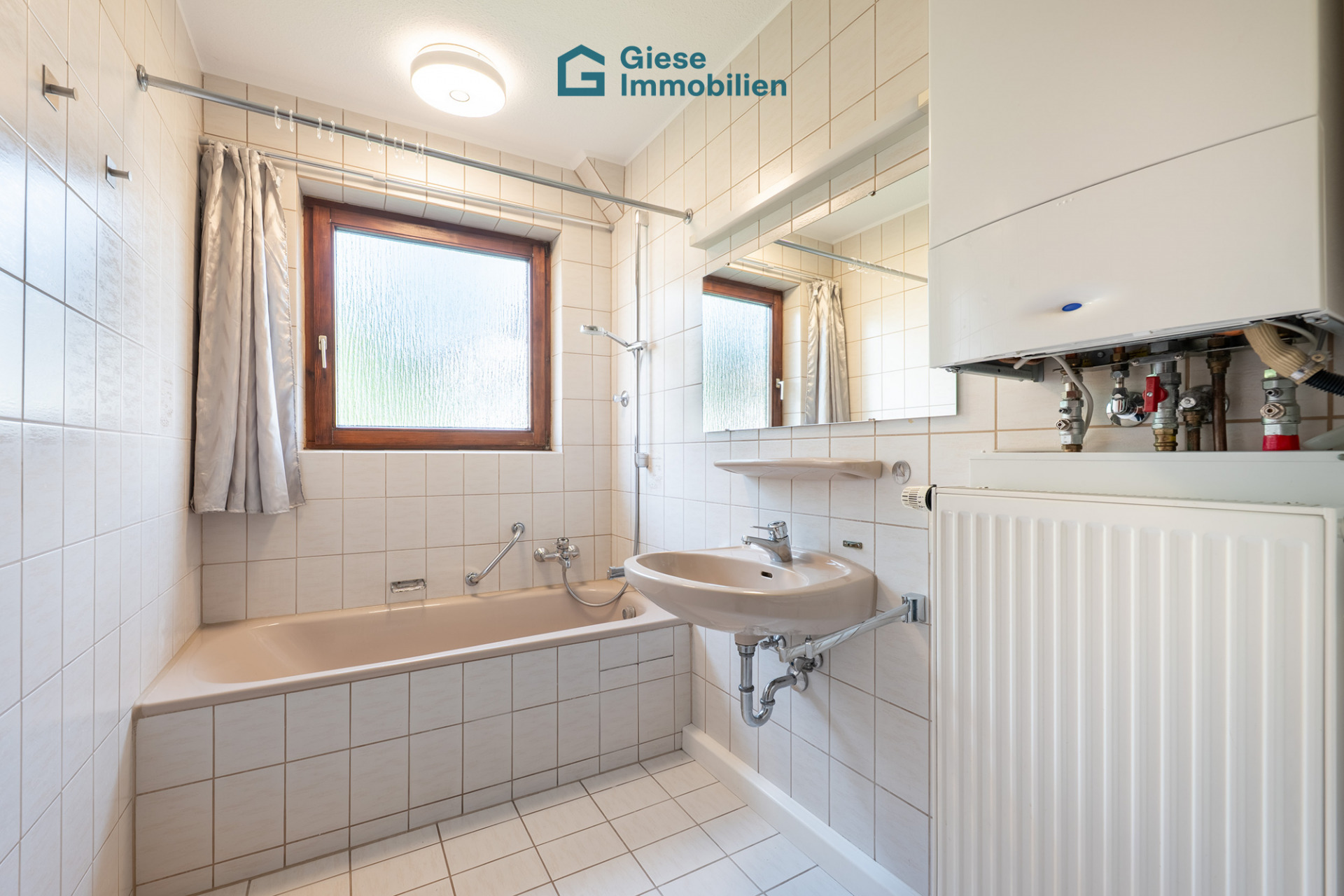 * zwei Bäder mit Badewanne, Waschbecken und Fenster